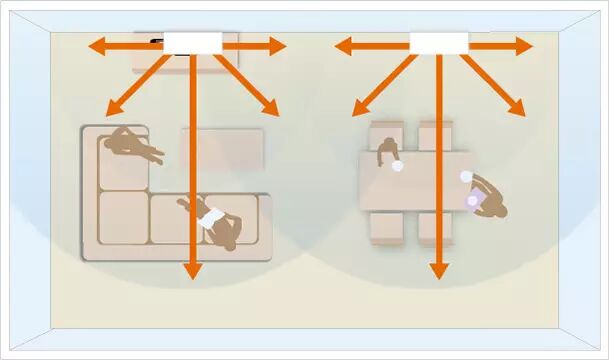 客厅风口在沙发或电视上方等人员不大活动的区域,几乎不影响层高感受,餐厅出风口还可以吹向封闭式厨房,中和餐厨热气,一箭双雕呐!