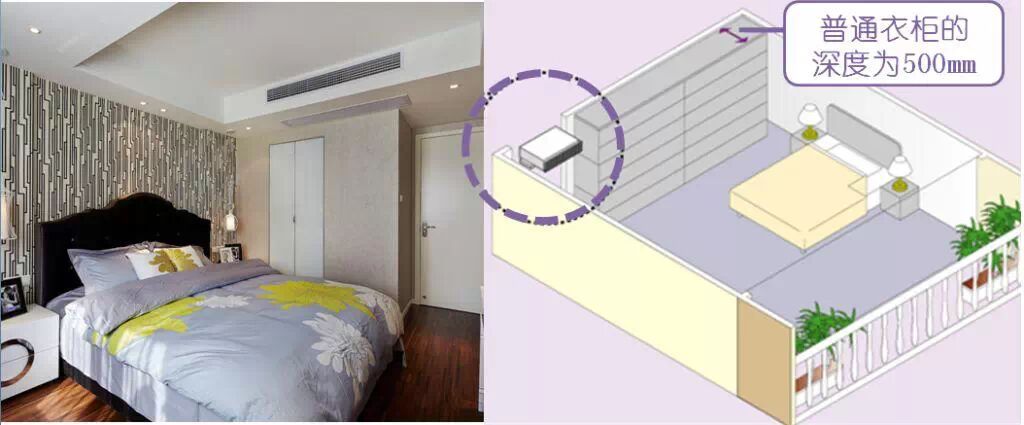 风管式室内机一般安装在卧室衣柜一侧的吊顶中。它一般“身材小巧”,可以与衣柜同宽,不会因超出吊顶墙面而显得突兀。它的安装方式灵活多样,配合内装简洁大方。