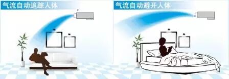如果你身在卧室,人体感应智慧眼便会自动感应你的活动范围,根据遥控器设定进行追踪或避开人体。例如夏日炎炎,想要在卧室看个片子凉爽一下,可以设定气流自动追踪人体;晚上睡觉时,可以设定气流避开人体,防止夜间睡熟后着凉。