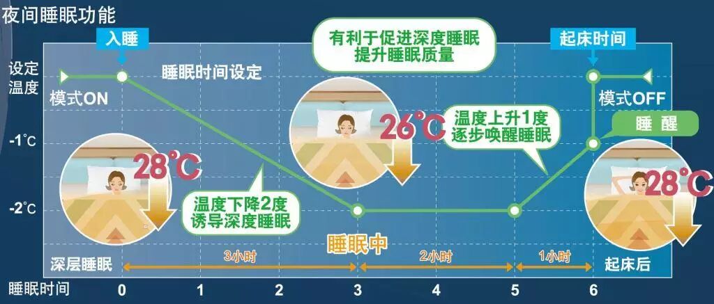 在您入睡后3小时内,慢慢降低2℃,配合体温下降,帮助您进入深度睡眠;