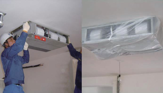 为保证排水畅通以及水盘无积水,吊装室内机时尤其注意要水平安装,还有,为保护内机防止灰尘侵入,吊装后应及时用塑料膜等材料包裹好室内机。