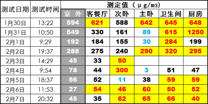 ※以上实测环境:上海杨浦区某小区3楼(2房2厅),2014年1月30日至2月7日,业主朱女士。检测设备:DUSTTRAK2。