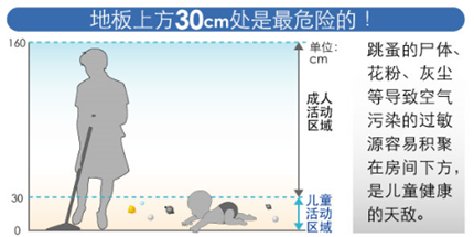 孩子的长大与爬行密不可分。从他们的身体贴在地面上学习爬行,再到开始在地上跑跑跳跳,总是不幸与地面上的各种积灰和看不见的螨虫、细菌、霉菌等有害物质狭路相逢。幼小的宝贝显然没有足够的意识与能力去抵御这些健康的天敌。他们的呼吸系统尚未发育完善,更易引发各种呼吸道疾病。而从PM2.5可入肺的角度看,婴幼儿的肺部占体重比例最大,因此PM2.5一旦大量入肺并进入血液,其负担也远比成人更为沉重。