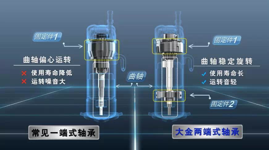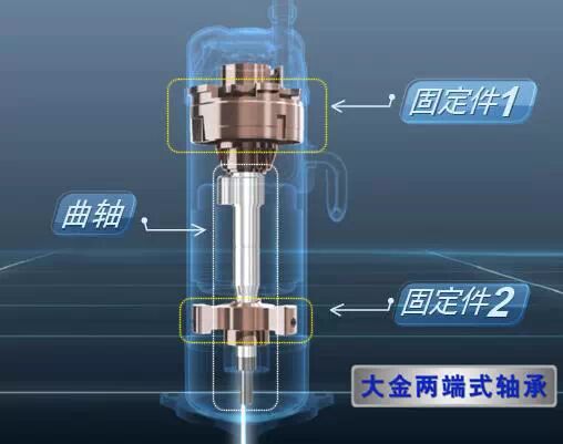 为了提高曲轴在高速运转时的稳定性,大金高低压腔涡旋式压缩机的曲轴在其上下部均采用固定件固定。相较于只采用一个固定件的低成本制作压缩机,大金压缩机运转时声音更轻,使用寿命更长。