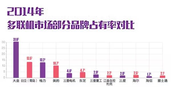 2014年度,大金31.6%的市场占有率,甚至超过了排名二、三位品牌的总和,继续以压倒性优势奠定着不可被撼动的霸主地位。
