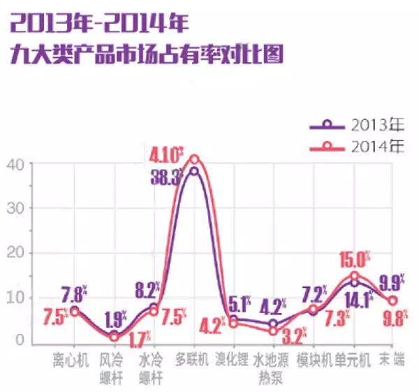 2014年全年多联机(包括变频多联机和数码涡旋多联机两大类)的市场占有率高达41%,这个数字已经超过了2014年度全年冷水机组产品的市场占比总和。