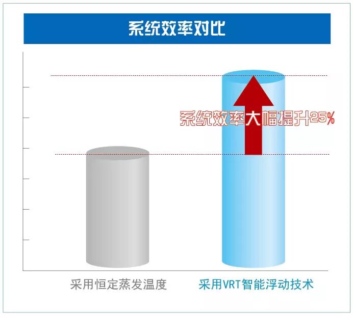 大金采用VRT技术,提升室内机蒸发温度时,空调制冷能力提升、压缩机消耗功率下降,系统运转更高效节能。