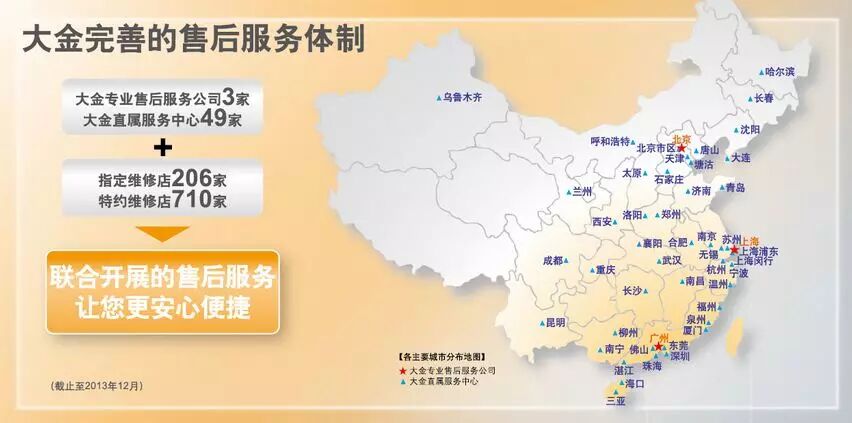 在中国,大金不仅建立了独立的售后服务公司专门从事售后问题的解决,并以北京、上海、广州三地为中心,发展了206家指定维修店和710家特约维修店来全面覆盖这片幅员辽阔的土地,便于为用户及时提供售后服务。