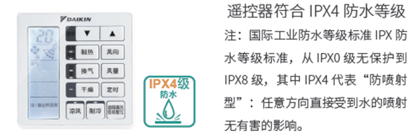 卫浴用室内机专用的有线遥控器,防水等级达到IPX4级,保证潮湿卫浴空间也能正常使用。