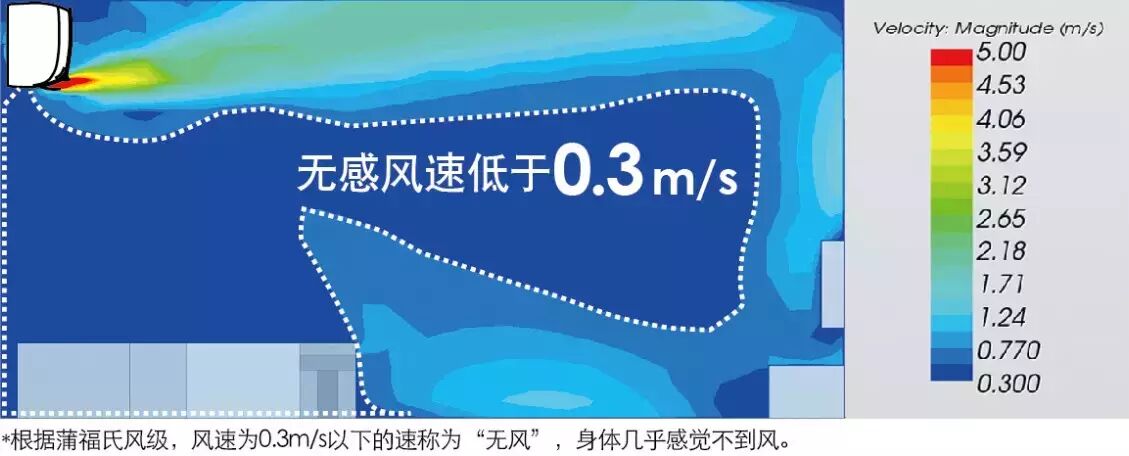 在房间中的人可以很快感受到温度的降低,却丝毫没有冷风直吹的不适感。根据实验数据,人所处的大部分区域风速低于0.3m/s,可谓“无感舒适”。从某种意义上说,从高处吹来的康达效应气流像极了轻柔的自然风,温柔而舒适,在无声无息中化解燥热。