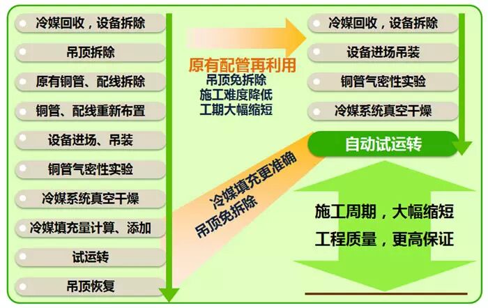 大金VRV 更新用Q系列,专为更新改造设计,简化改造步骤,大幅缩短施工周期,减小对建筑用户的使用影响及对装潢的影响,同时可延用原有系统的铜管、配线,避免大面积拆除吊顶,有效降低改造成本,缩短改造周期。
