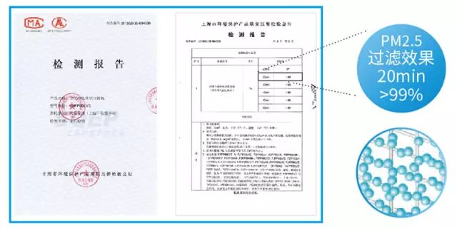 *检测机构:上海市环境保护产品质量监督检验总站,通过GB/T18801-2008(空气过滤器)测试方法,在体积30m²,温度(23-27)℃,湿度(40-60)%RH的测试舱内,20min内PM2.5过滤效率达到99%。