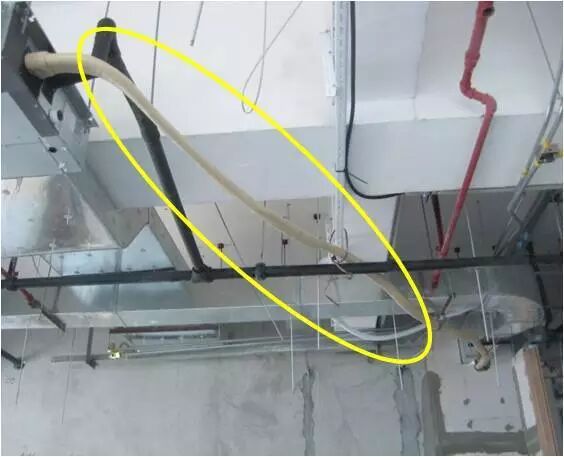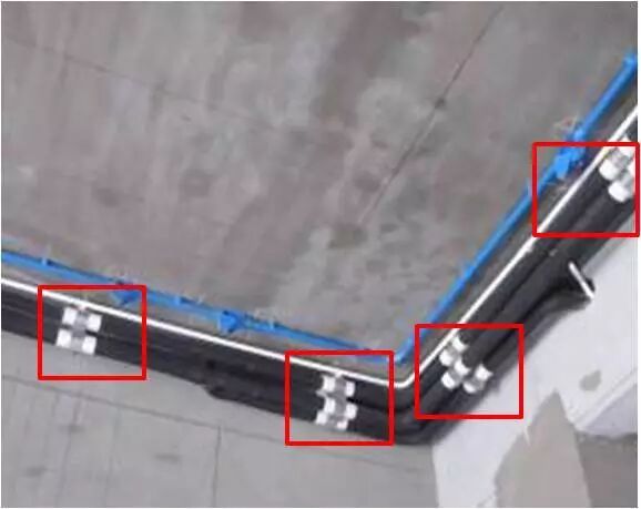 6、为了防止冷媒管路因固定不良而出现下垂变形,要求冷媒配管在每1.2米~1.5米,以及配管转弯前后都应使用管箍进行支撑固定。
