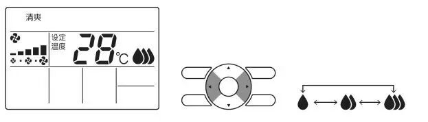 →设定湿度上升,←设定湿度下降共有三档湿度循环设定,三颗小水滴代 表低、中、高三档湿度。