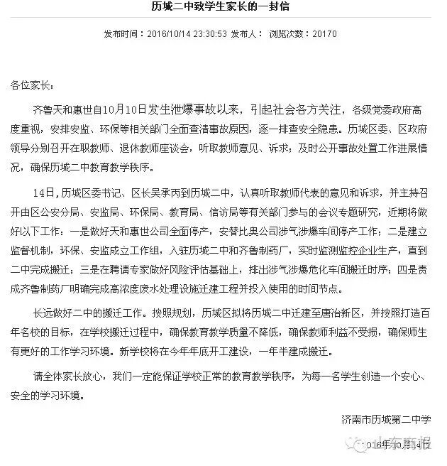 前天晚上23:30,历城二中在其官方网站上发布了《历城二中致学生家长的一封信》,信中就一些情况进行了说明。